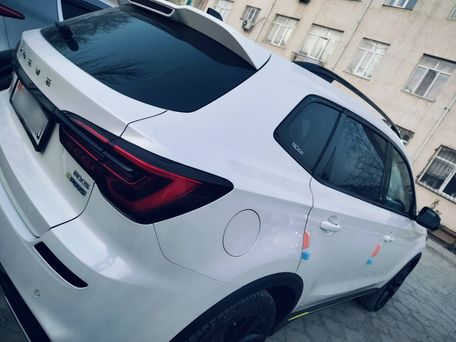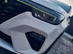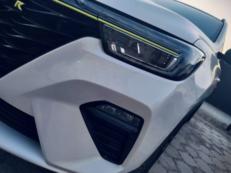 Детали экстерьера и салона соответствуют современному поколению RX5 eMAX: городской кроссовер с возможностью подзарядки от сети и экономичным расходом в смешанном цикле. Белый цвет кузова, контрастные чёрные вставки, акценты лайм‑цвета по периметру. Номера KG.